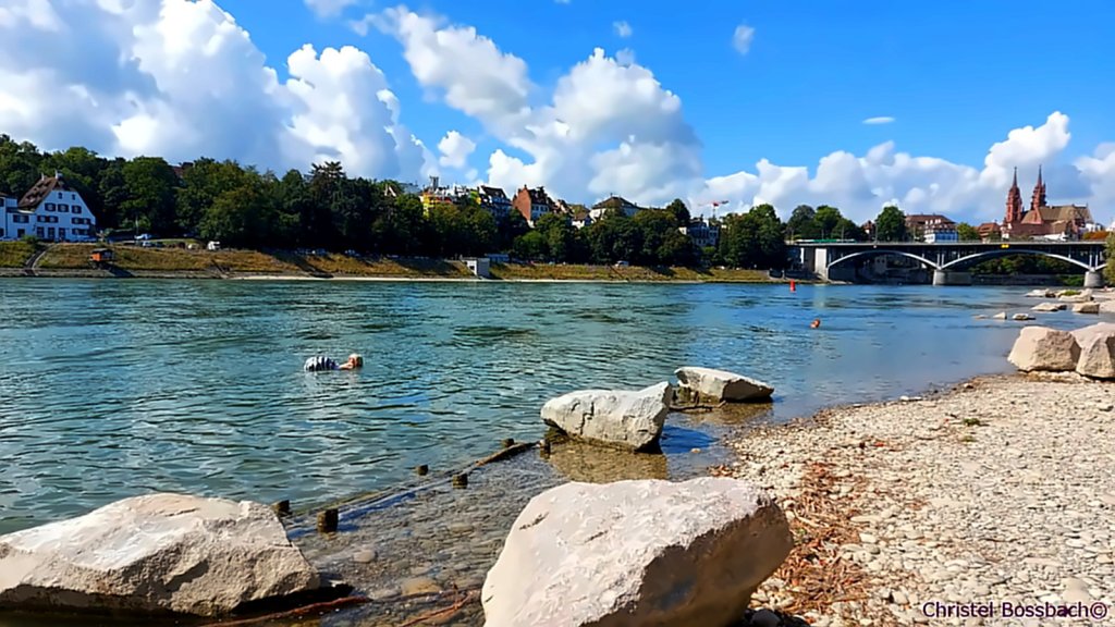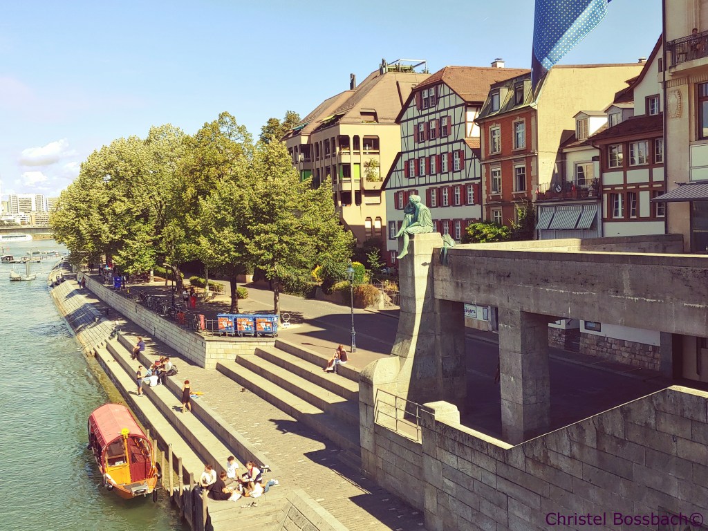 Erst im August letzten Jahres ging mein Wunsch endlich in Erfüllung. Wozu sonst habe ich Frei- und Fahrtenschwimmer geschafft und ab dem Alter von 10 mit zwei Stoff-„Wapperln“ auf den Badeanzügen angeben können? An einem Montag gegen 12 Uhr nutzte ich in Basel die Möglichkeit des „Rheinschwimmens“ – ein offiziell genehmigtes Sommervergnügen, dass sich die Einheimischen und immer mehr Gäste zu tausenden am Wochenende gönnen. Oder werktags in der Mittagspause. In einem um den Bauch gebundenem „Wickelfisch“ aus Kunststoff lassen sich Kleidung und Handy trocken transportieren. Am Kleinbaseler Ufer bin ich ins Wasser und habe mich schwimmend treiben lassen. Etwa ein Drittel des Flusses ist mit Bojen dafür reserviert, jenseits dann der ohnehin nicht allzu rege Schiffsbetrieb. Ausstiege am Ufer, Duschen und der „gastronomische Buvette-Betrieb“ warten auf hungrig gewordene Wasserratten. Ungefähr seit der Jahrtausendwende reichten die Freibäder am Rheinufer den Schwimmfans nicht mehr aus, und die gestiegene Wasserqualität war ein starkes Argument.