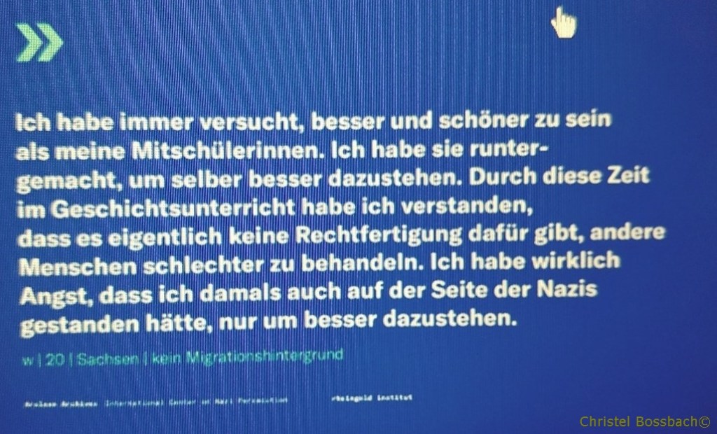 Die Interviews offenbaren aber auch die Barrieren, die eine Beschäftigung mit der NS-Zeit blockieren können. Neben der Angst, von Gefühlen überwältigt zu werden, zählt dazu die Angst vor einer „Überkomplexität“ von Sachverhalten (etwa im Unterricht) fern der eigenen Lebenswirklichkeit. Oder wenn den Jugendlichen Moral „verordnet“ werde, statt sich ein eigenes Resümee zu erarbeiten. Jede Generation reklamiere für sich, selbst zu denken und sich ein Bild zu machen, meint auch Oliver Figge von den Arolsen Archives. Es gelte die Verknüpfung mit heutigen Entwicklungen zu schaffen, „denn die Gründe der Verfolgung sind nicht Geschichte“. Eine der Befragten wird so zitiert: