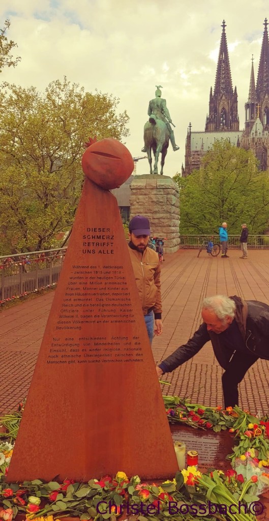 Was ich erfahre: das Mahnmal erinnert an den Völkermord an den Armeniern 1915 und stand zum 2018 zum ersten Mal an dieser Stelle. Im Juni 2016 erkannte der Bundestag den Völkermord trotz massiver Proteste der Türkei an. Parlamentspräsident Lammert wies in seiner Rede darauf hin, dass Deutsche Reich habe damals Mitschuld auf sich geladen. Aufarbeitung der Vergangenheit sei Voraussetzung für Versöhnung und Zusammenarbeit. Eine Woche nach der Aufstellung entfernte die Stadt Köln das Denkmal. Zum Gedenktag musste es auch vor dem 24.4.2022 per LKW herbeigeschafft werden. Diesmal soll das Mahnmal aber bleiben als „ein öffentlicher Ort des Erinnerns, der Trauer, des Gedenkens und der Abkehr von Rassismus und Nationalismus“  (mehr Informationen z.B. www.voelkermord-erinnern.de).