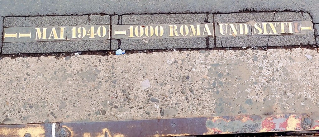 Wenige Meter weiter ist Geschichte in den Asphalt eingefügt: Ein Hinweis auf das „Messelager“ neben der Brücke. Es war ab 1939 Sammel-, Auffang- und Gefangenenlager mitten im Messekomplex. Meine Großmutter erzählte, wie sie auf der Brücke aus dem Zugabteil heruntersehen konnte auf die Menschen im Lager. Ab Mai 1940 wurden auch Sinti und Roma von dort nach Polen deportiert. Was ich erst seit gestern weiß: die Stadt Köln selbst betrieb das Messelager als „Außenlager des KZ Buchenwald“.