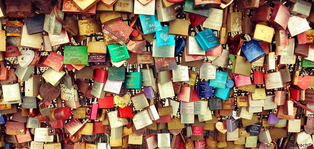Auf dem Fußweg der Hohenzollernbrücke sind Leute jeden Alters unterwegs, Sprachfetzen geben Rätsel auf. In den Gesichtern lässt sich die ganze Palette der Gefühle erkennen: Neugierde, Freude, Nachdenklichkeit, Ärger, Verliebtheit oder Einsamkeit… Funny kassiert wie immer Lächeln der Entgegenkommenden. Auf der einen Seite geht der Blick über den Rhein, auf der anderen am Gitter zu den Gleisen hängen dicht an dicht „Liebesschlösser“ mit eingekratzten Namen und Daten. Ein Physiker hat schon 2015 ihre Zahl auf 450 000 geschätzt. Liegen die Schlüssel alle im Rhein? Emotionen, Versprechen, Nähe – was lässt sich überhaupt verschließen, was braucht Freiheit? Darüber ließe sich nachdenken, würde der Hund sich nicht gerade blitzschnell ein nicht zu identifizierendes Etwas einverleiben.