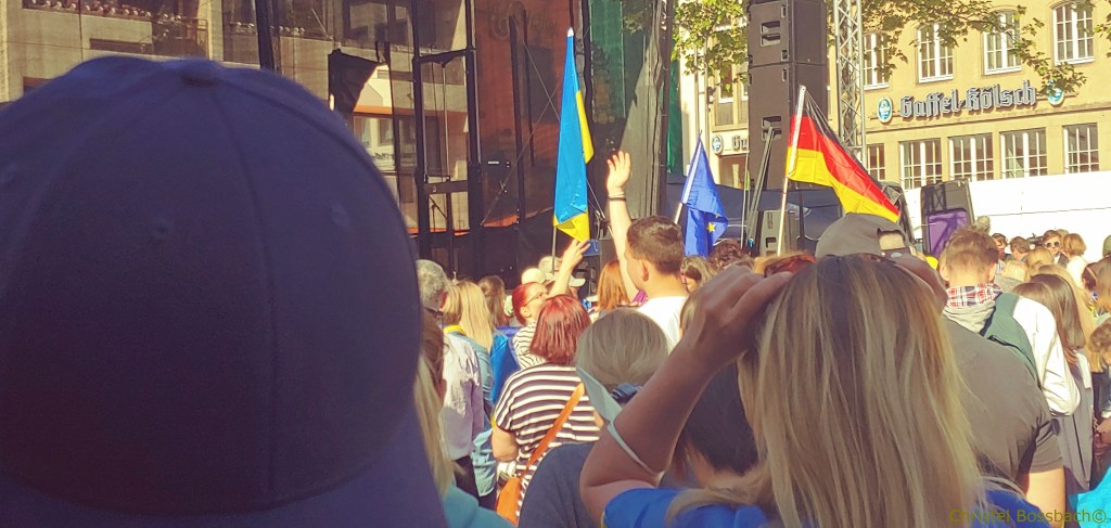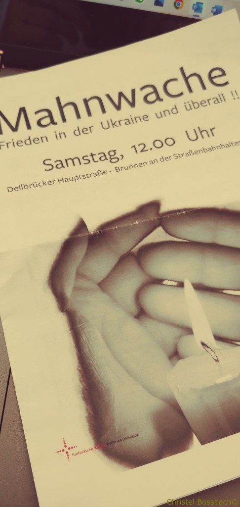 Am 150. Kriegstag stolperte ich heute im Kölner Vorort förmlich über rund 60 Menschen, die sich dort seit Kriegsbeginn jeden Samstag um 12 Uhr zu einer „Mahnwache – Frieden in der Ukraine und überall“ versammeln. Ein paar Bläser, ein Text- und Liedblatt, ein Mann mit Mikro und kleinem Verstärker. Die katholischen und evangelischen Gemeinden bereiten die Mahnwachen vor. Allein das Singen von „Hewenu schalom alejchem“ oder „Dona nobis pacem“ lässt meinen Atem fließen und auch ein paar Tränen. Der Körper erinnert sich an frühere Erfahrungen. Kraft und Zuversicht können sich ausbreiten, wenn ich mich traue, Angst und Erschrecken ebenso zu teilen wie Freude über Feste und gelungenes Leben.