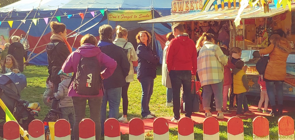 Am Sonntag großer Andrang vor dem Zirkuszelt und dem Stand mit den altmodischen Süßigkeiten. Aufgeregte Kinder, die Väter und manche Mütter rauchen schnell noch eine. Grelle Plakate. Es wirkt alles wie mit einer Zeitmaschine zurück gebeamt in die 1970er oder 1980er Jahre. Keine LEDs, keine Bildschirme mit Ankündigungen. Könnte der Blick in eine bescheidenere Zukunft sein. „Vergiss nicht zu lächeln“ – heißt es auf englisch über dem Eingang zum Zelt.