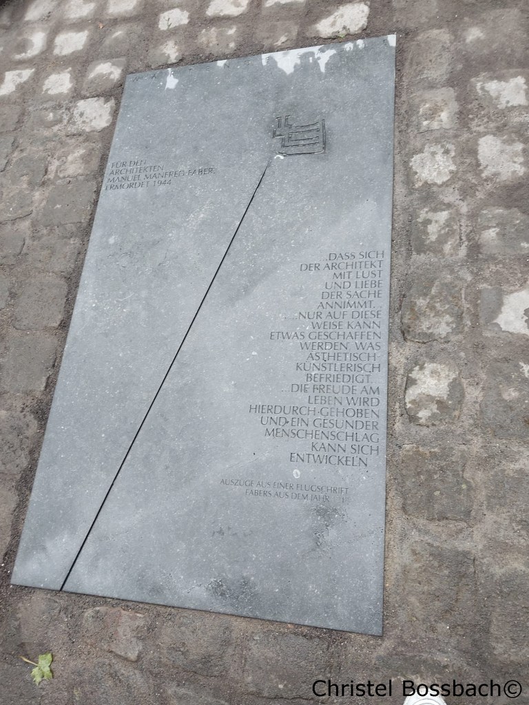 Zur Enthüllung des Denkmals am 25.8.2023 versammelt sich eine „bunte“ Mischung von Menschen, unter denen jemand wie Manfred Manuel Faber als „Zeitreisender“ nicht aufgefallen wäre. Über Jahrzehnte schien seine Existenz wie ausgelöscht, es gibt nur ein Foto, das ihn zeigen soll. Mit grauem Hut. Auf der Bodenplatte des Denkmals finden sich ein Zitat aus seiner „Flugschrift“ nach dem 1.Weltkrieg und eine gezeichnete „Bauflucht“ der Siedlung. Auf der steinernen Bank liegt quer die „Wartende Säule“, die auch ein zufällig während der Arbeit abgelegter überdimensionaler Stift sein könnte. Wie der Künstler David Semper erläutert, steht diese Zufälligkeit für ihn im Kontrast zur Endgültigkeit der Ermordung Fabers. Damit bleibe die „Wartende Säule“ und den Menschen heute nichts anderes als weiter zu zeichnen, zu schreiben… Und sich zu informieren mit Hilfe eines QR-Codes, der weiterleitet an das NS-Dokumentationszentrum der Stadt Köln.